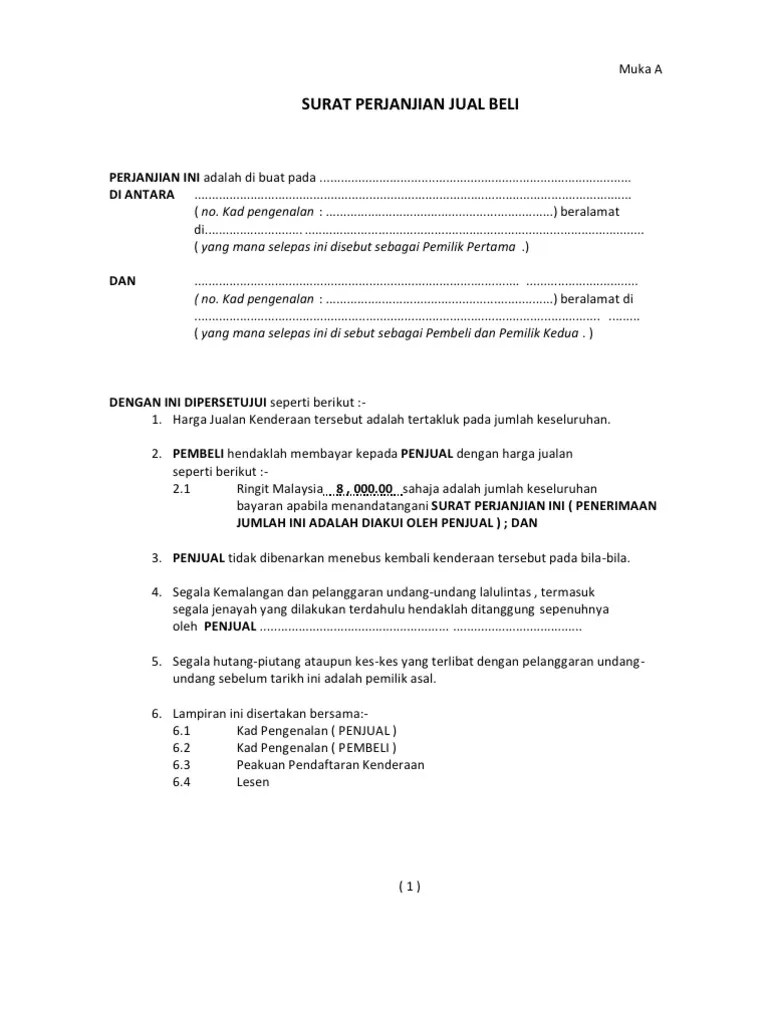 Contoh surat perjanjian jual beli kereta second hand (terpakai) dan agreement untuk kereta sambung bayar yang mana tanpa tukar nama. Contoh perjanjian jual beli kenderaan. Bahawasanya surat perjanjian ini diperbuat pada . Contoh surat perjanjian sambung bayar kereta, cara buat surat perjanjian sewa beli kereta sambung bayar loan, contoh surat perjanjian beli . Contoh surat perjanjian sewa beli kereta. · polis atau jpj atau sebagainya,saya bertanggungjawab sepenuhnya kepada kereta tersebut/ .